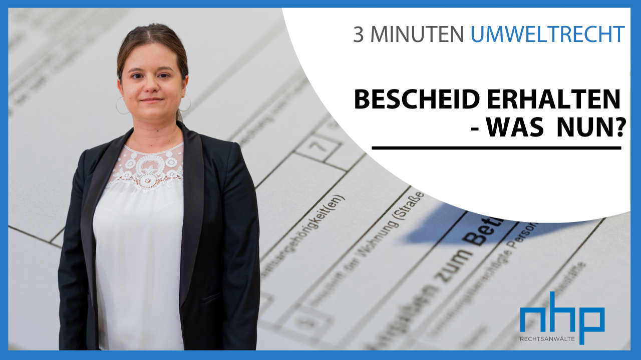 Sie haben einen Bescheid erhalten und jetzt? Wo fangen Sie an zu lesen? Auf was müssen Sie besonders achten? Welche Fristen müssen Sie unbedingt einhalten? Im neuen „3 Minuten Umweltrecht“-Video erklärt NHP-Rechtsanwältin Lisa Vockenhuber die wichtigsten Punkte, auf die Sie achten sollten.