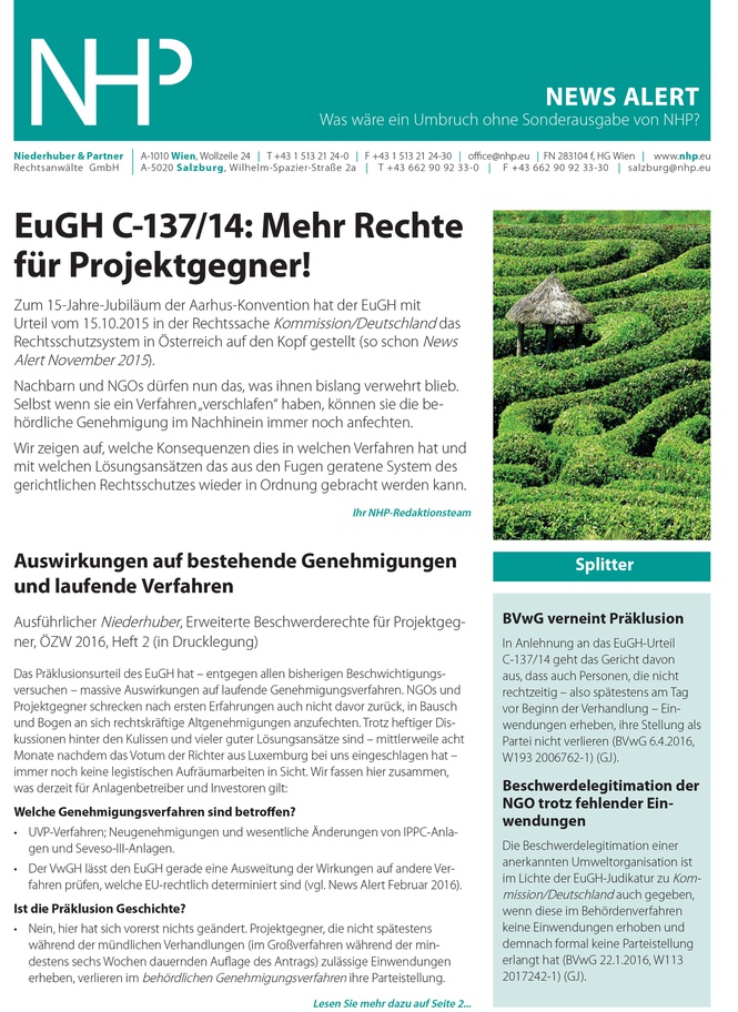 Die NHP News Alert Sonderausgabe zu den weitreichenden Folgen des EuGH-Präklusionsurteils C-137/14 ist mit folgenden Themen erschienen: