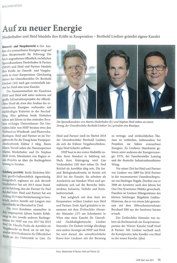 Fachzeitschrift JUVE, "Auf zu neuer Energie. Niederhuber und Heid bündeln ihre Kräfte in Kooperation"