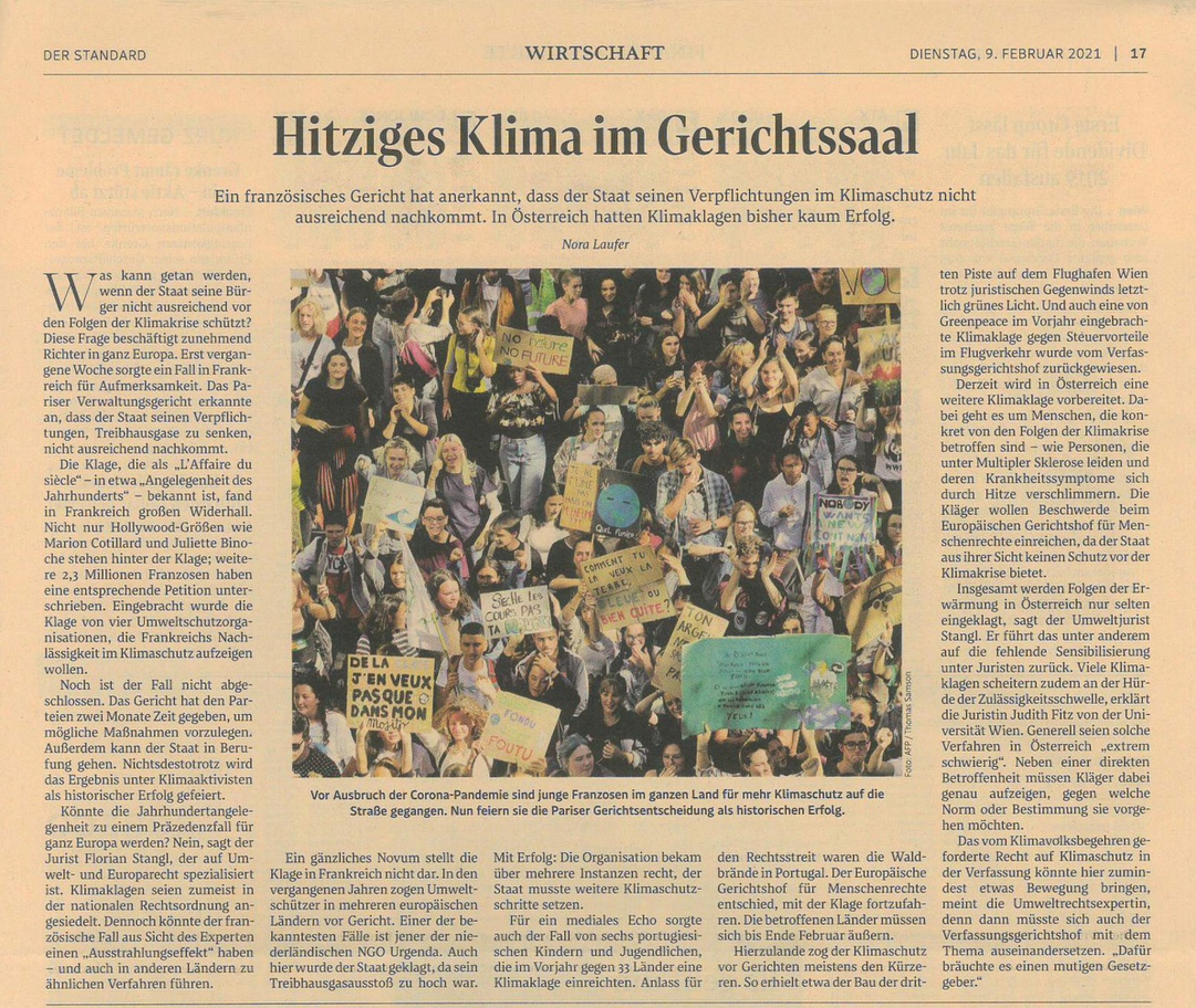 "Hitziges Klima im Gerichtssaal" - Artikel in der Tageszeitung Der Standard mit Florian Stangl
