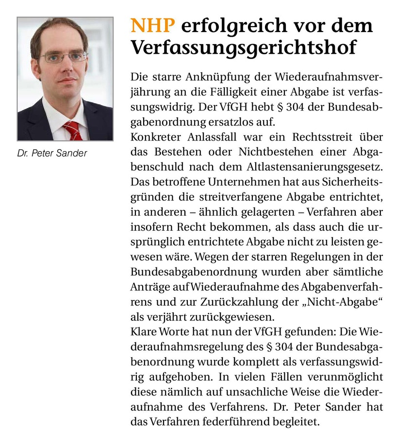 NHP erfolgreich vor dem Verfassungsgerichtshof